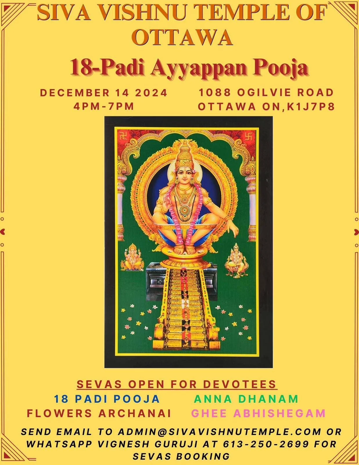 The Siva Vishnu Temple of Ottawa is delighted to host the Karthiga Maasa Ayyappa Pooja for the first time in Canada's Capital City, Ottawa. This auspicious and sacred occasion will bring together devotees for prayers, bhajans, and community fellowship, with all event activities and dinner offered free of charge to participants.