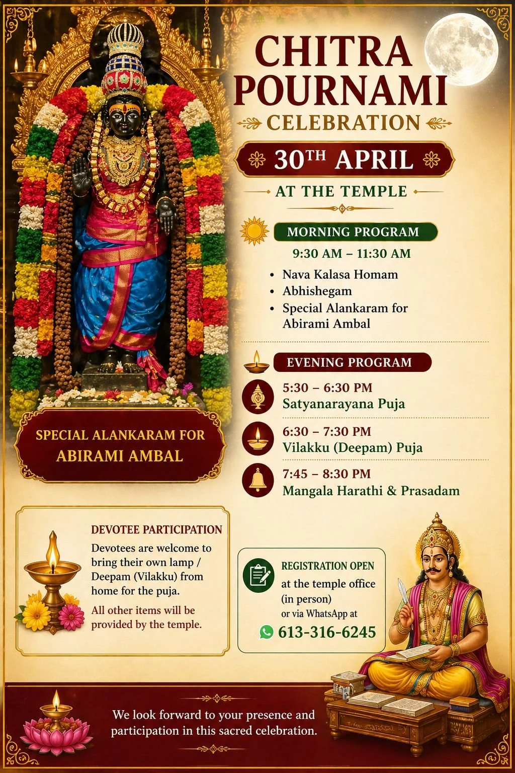 On the sacred full moon day of Chitra Pournami, worship of Abirami Ambal holds special importance. It is believed that Ambal blessed Lord Chitragupta, the divine recorder of human deeds, granting him the wisdom and authority to guide beings on the path of righteousness.