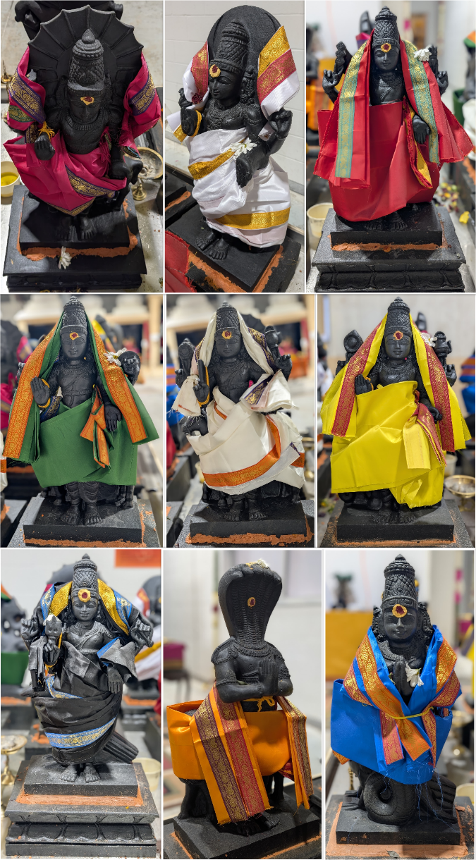 The Navagrahams include the nine celestial deities who influence various aspects of life: Surya (Sun), Chandra (Moon), Mangala (Mars), Budhan (Mercury), Guru (Jupiter), Shukra (Venus), Shani (Saturn), Rahu, and Ketu. Worshipping them is believed to remove obstacles, mitigate negative planetary influences, and bring peace, prosperity, and harmony.